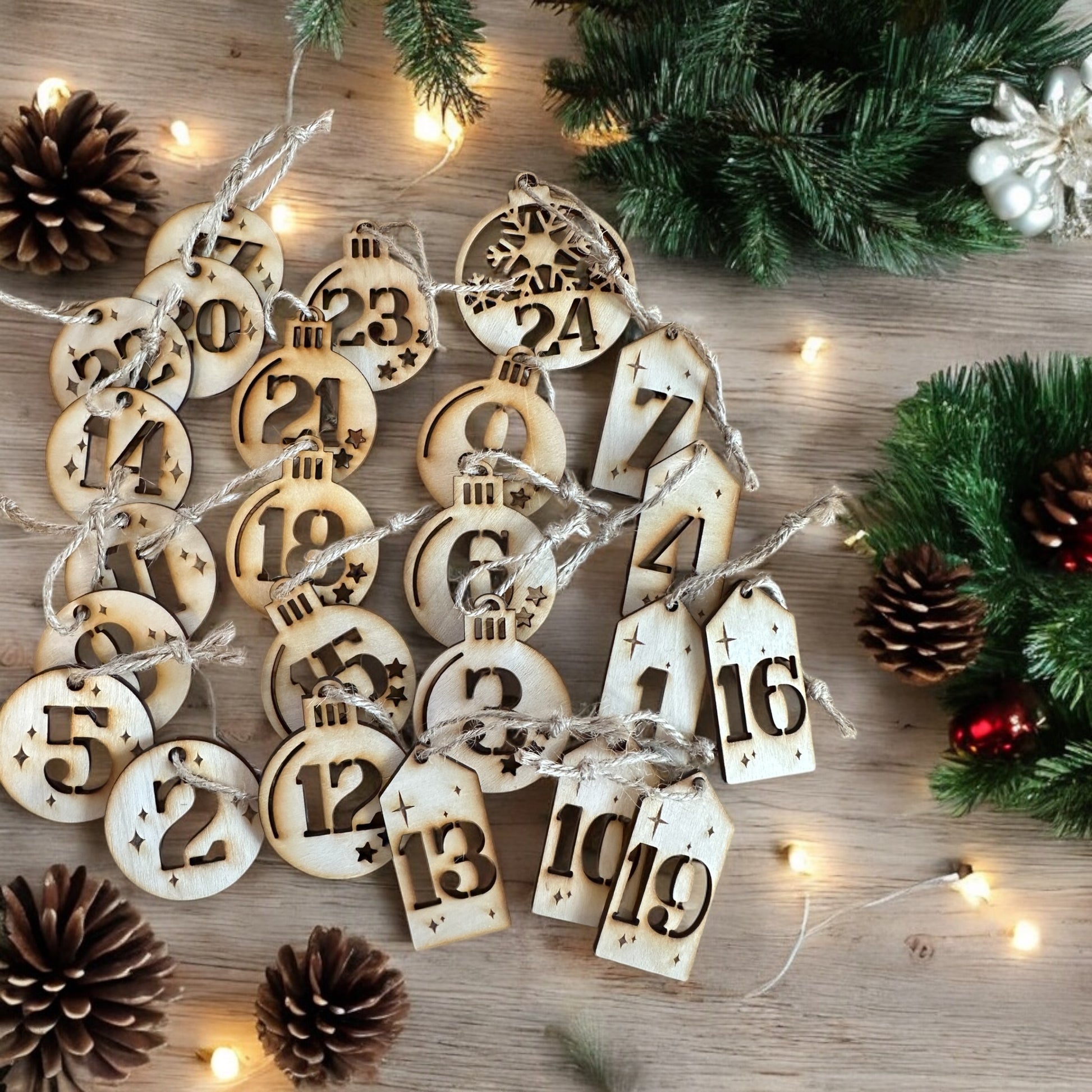 Her får du 24 «julekuler» som du kan henge opp der du måtte ønske.