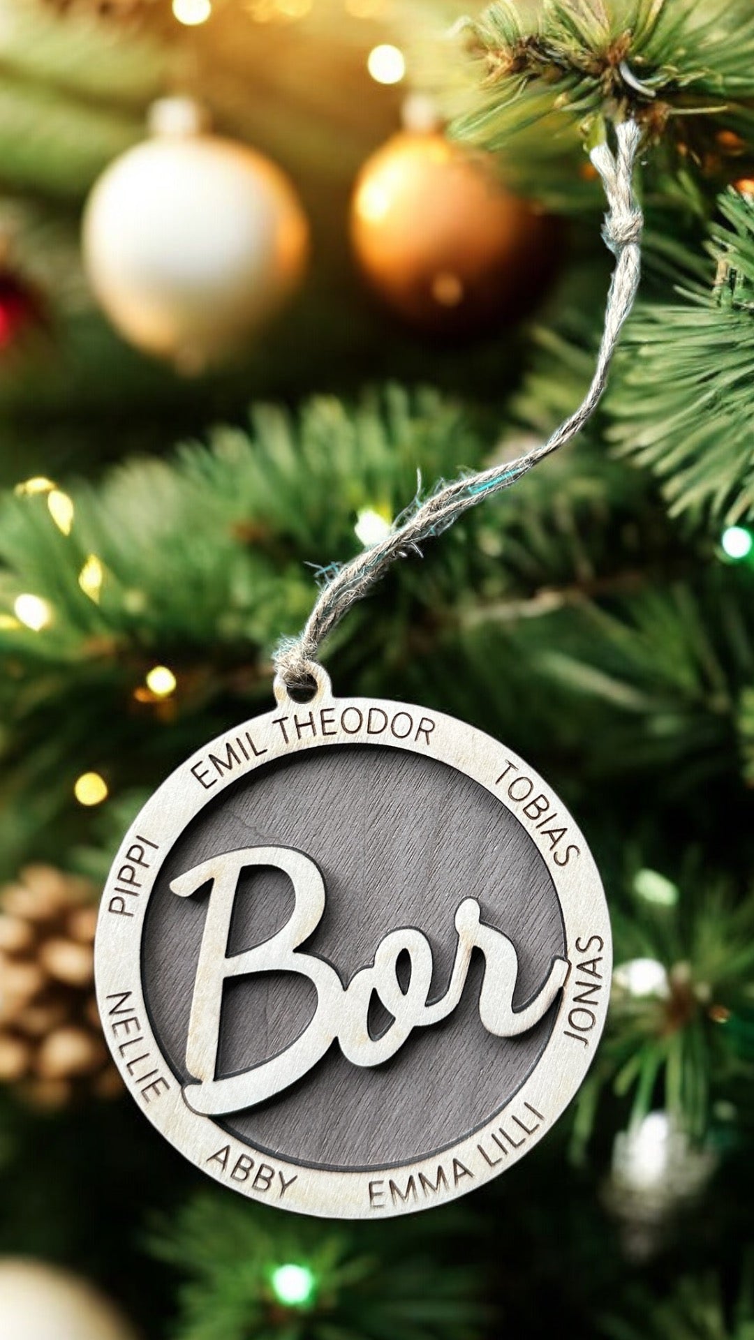 Her får du valgfritt navn/ord utskjært i midten og valgfrie navn eller tekst gravert inn rundt.